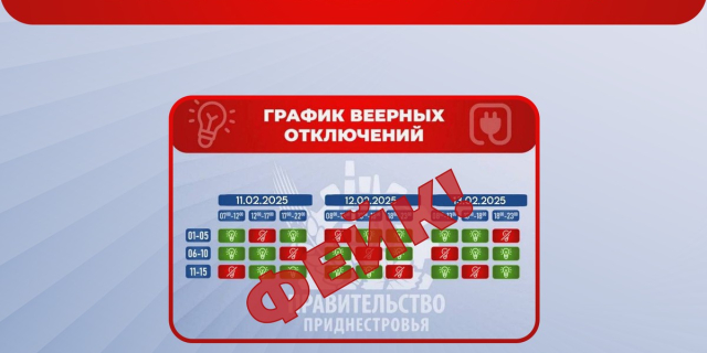 В соцсетях распространяется фейковый график веерных отключений света Пресс-служба Правительства ПМР призывает доверять исключительно проверенным источникам информации 04 Фев., 2025, 13:59 Общество Правительство ПМР ЧП в экономике