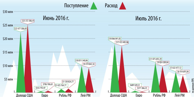 В июне и июле ПРБ оперировал преимущественно долларами США Центробанк опубликовал информацию о поступлении и расходовании валютных средств в связи с заявлениями коммерческих СМИ о переводе экономики республики в леевую зону 26 Авг., 2016, 17:23 Инфографика Инфографика Приднестровье