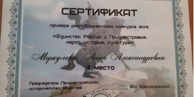 В Тирасполе подвели итоги конкурса эссе «Россия и Приднестровье: народ, история, культура» В конкурсе, прошедшем под эгидой Приднестровского исторического общества, приняло участие 26 работ студентов и школьников 08 Ноя., 2017, 18:00 Культура конкурс История