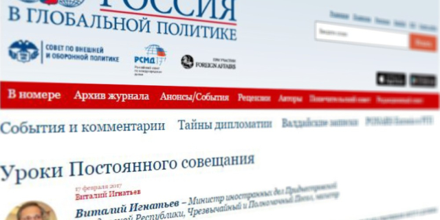 Журнал «Россия в глобальной политике» опубликовал статью главы приднестровского внешнеполитического ведомства Виталия Игнатьева. По мнению дипломата, Приднестровье исходит из того, что функционал формата «5+2», а также потенциал и опыт его участников могут и должны быть реализованы более эффективно, в том числе через придание диалогу ритмичного, регулярного характера.