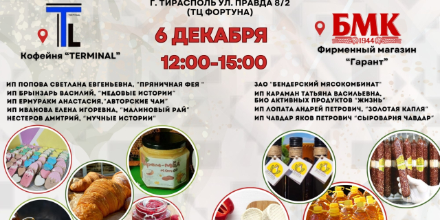 Торгово-промышленная палата приглашает на дегустацию продукции отечественных производителей Попробовать сладости, авторские чаи, мясную продукцию и крафтовые сыры можно будет в Тирасполе 6 декабря 01 Дек., 2024, 11:38 Общество ТПП Покупай Приднестровское